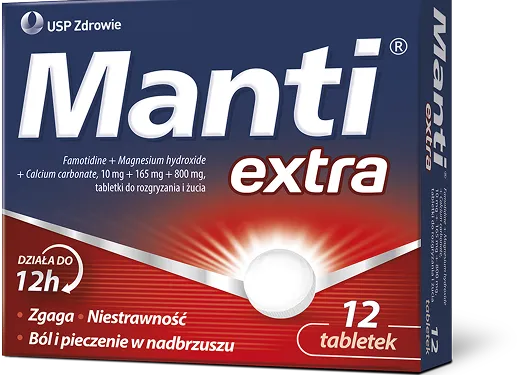 Manti Extra to szybkie1, objawowe leczenie dolegliwości związanych z nadkwaśnością soku żołądkowego, takich jak zgaga, niestrawność oraz ból i pieczenie w nadbrzuszu do 12 godzin2.