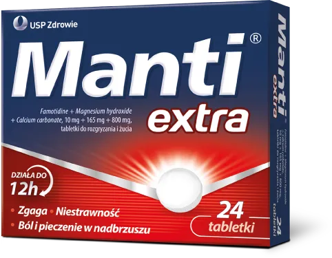 Manti Extra to szybkie1, objawowe leczenie dolegliwości związanych z nadkwaśnością soku żołądkowego, takich jak zgaga, niestrawność oraz ból i pieczenie w nadbrzuszu do 12 godzin2.