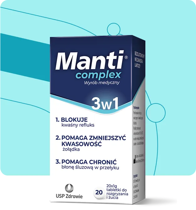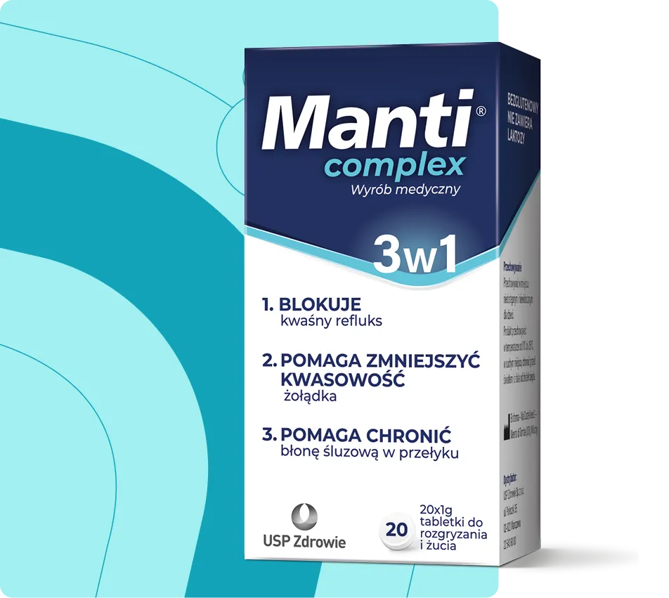 Wyrób medyczny Manti Complex jest przeznaczony dla dorosłych oraz dzieci po 12. r.ż. i wskazany w leczeniu refluksu żołądkowo-przełykowego. Zawarte w nim składniki, poprzez działanie mechaniczne, zmniejszają związane z nim objawy, takie jak: